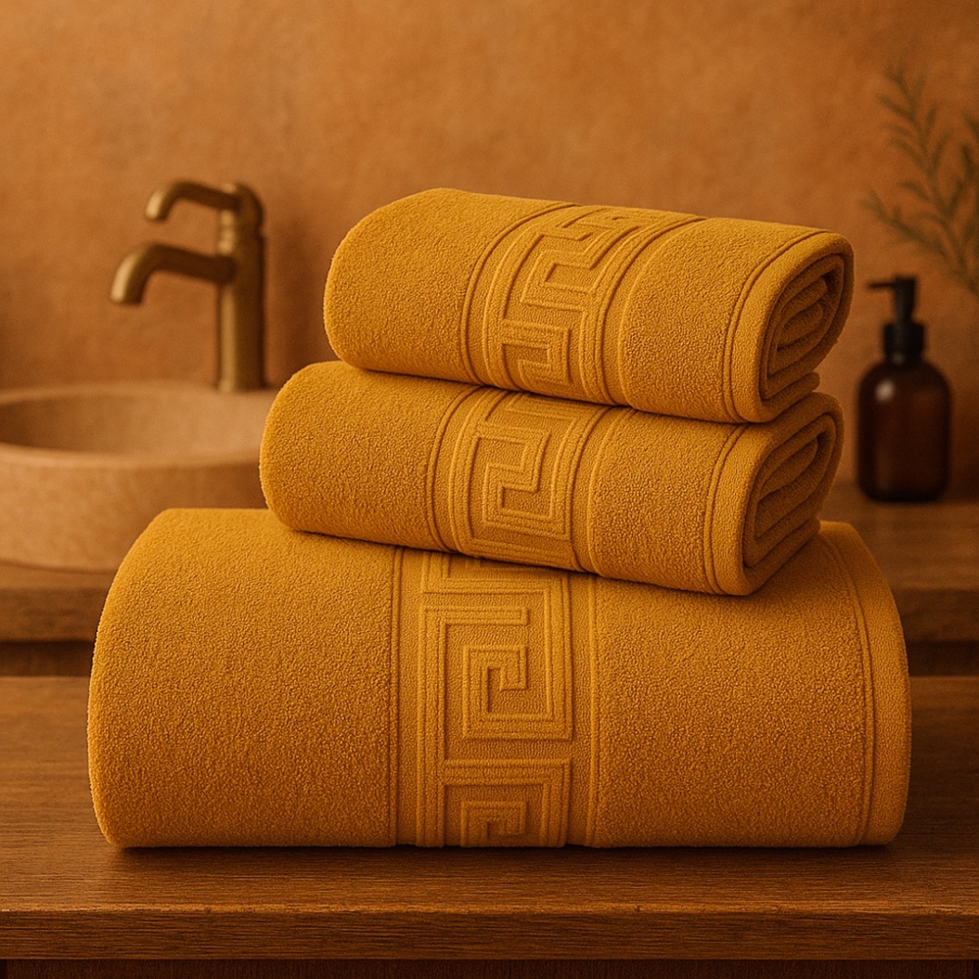Set 3 Prosoape din 100% Bumbac Pakistanez, 2 x 50x90cm si 1 x 70x130cm, Mustar