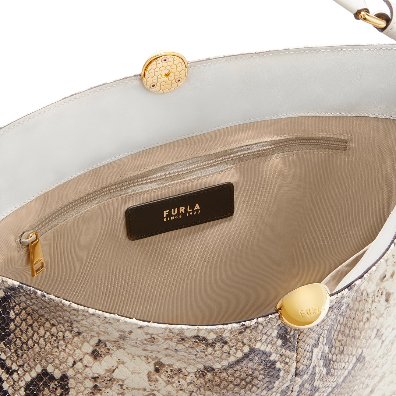 Furla spune povestea unui vis. Încă din 1927 Furla creează genți, portofele, pantofi și mici accesorii din piele atât pentru femei, cât și pentru bărbați. Stilul italian este întipărit în ADN-ul companiei și se regăsește în fiecare detaliu de la materiale la culori. Sfera Soft este o geantă elegantă și modernă, cu un design minimalist și linii curate. Realizată din piele fină cu imprimeu de piton, geanta impresionează prin rafinament și textură sofisticată. Forma ergonomic adaptată brațului asigură un confort excelent, iar detaliul metalic Sfera cu închidere magnetică adaugă o notă distinctivă.