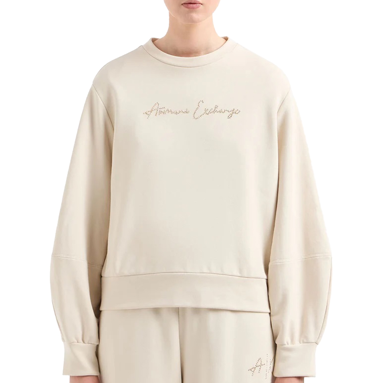 Armani Exchange este o extensie a brandului lansat în 1991 de către Giorgio Armani, o linie special concepută pentru a ilustra cele mai noi tendințe potrivite pentru toți amatorii stilului urban. Acest hanorac pentru femei de la Armani Exchange îmbină eleganța subtilă cu un design casual și modern. Culoarea bej adaugă versatilitate, iar logo-ul de pe față, decorat cu strasuri, oferă un detaliu rafinat și strălucitor. Cu un guler rotund și mâneci lungi, acest hanorac este perfect pentru un look confortabil, dar sofisticat, potrivit pentru orice moment al zilei.