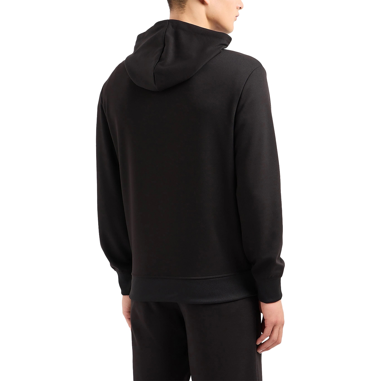 Armani Exchange este o extensie a brandului lansat în 1991 de către Giorgio Armani, o linie special concepută pentru a ilustra cele mai noi tendințe potrivite pentru toți amatorii stilului urban. Hanoracul A|X cu guler rotund și glugă este confecționat dintr-un material interlock elastic, oferind un confort sporit și o potrivire flexibilă. Designul este personalizat cu un logo contrastant pe față, aducând un accent modern și distinctiv. Modelul include manșete și tiv elasticate și nervurate, completând aspectul sportiv și urban al hanoracului, perfect pentru un stil casual contemporan.