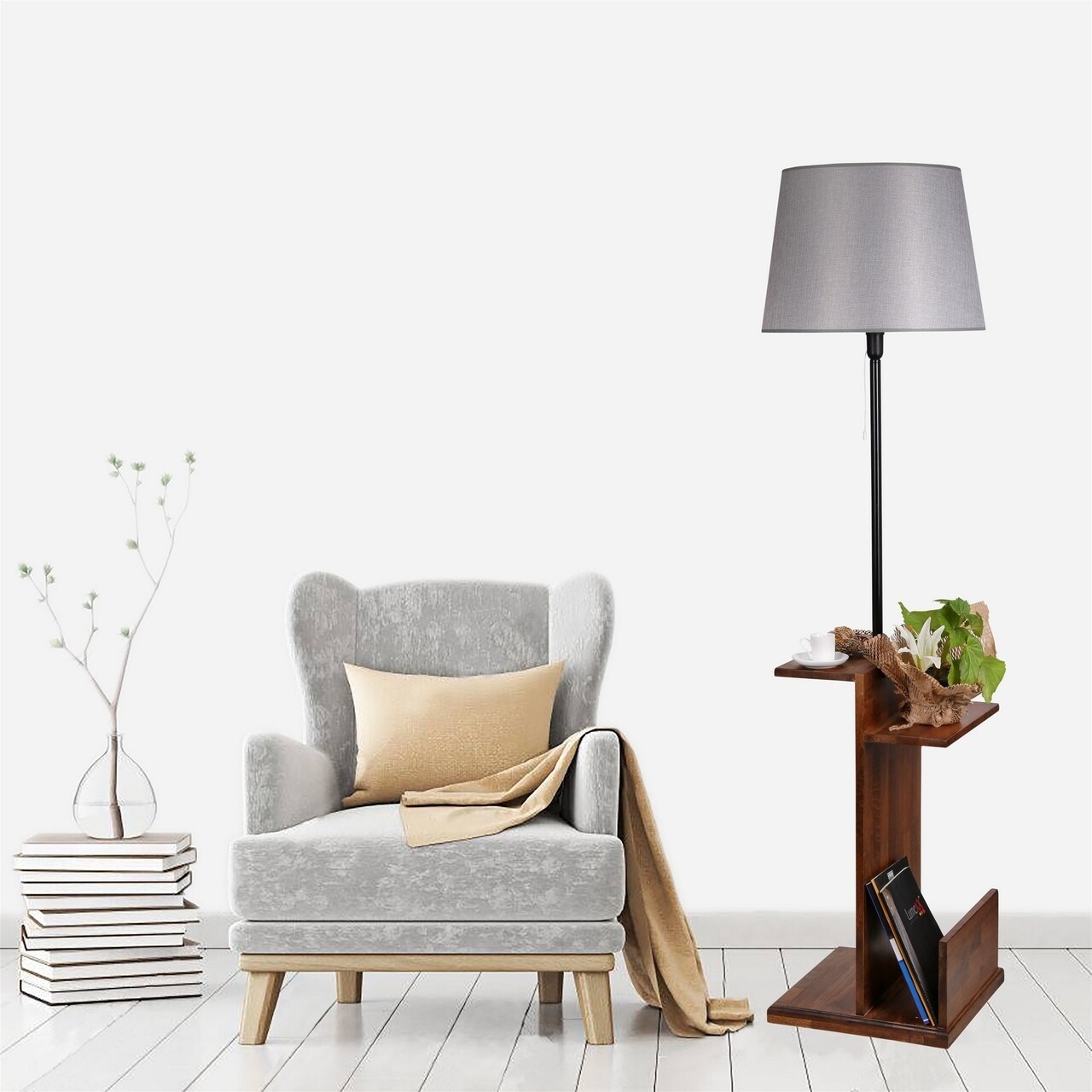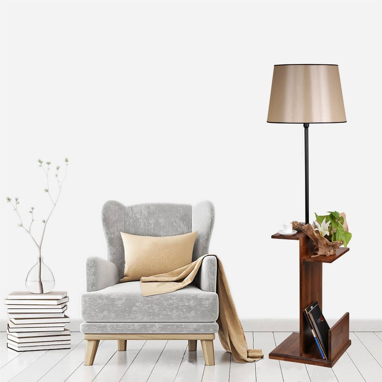 Lampadar cu rafturi, Luin, 8274-8, E27, 60 W, metal/lemn/textil