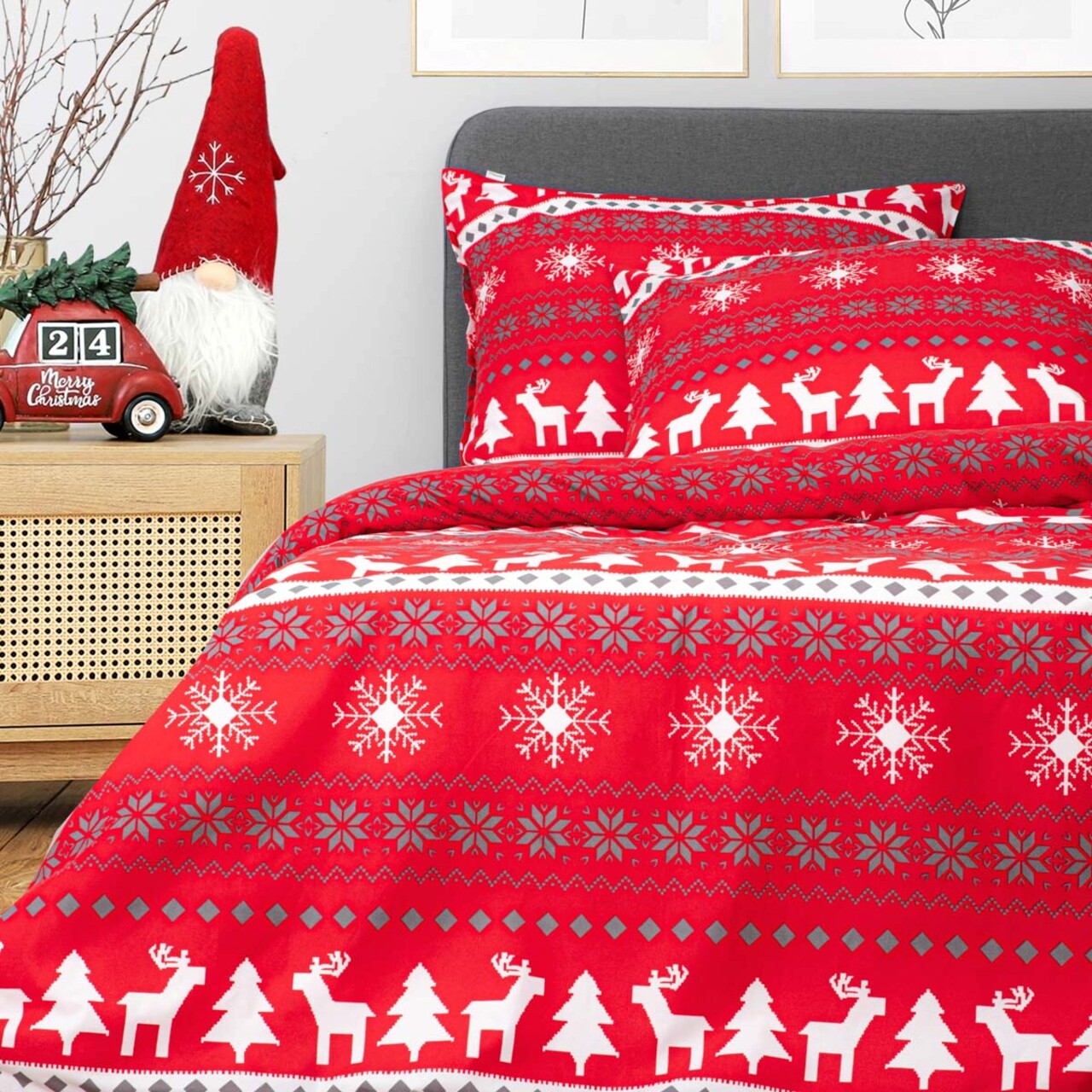Lenjerie de pat King Size, Renna, Homla, 200x220 cm, microfibra din poliester, rosu/alb